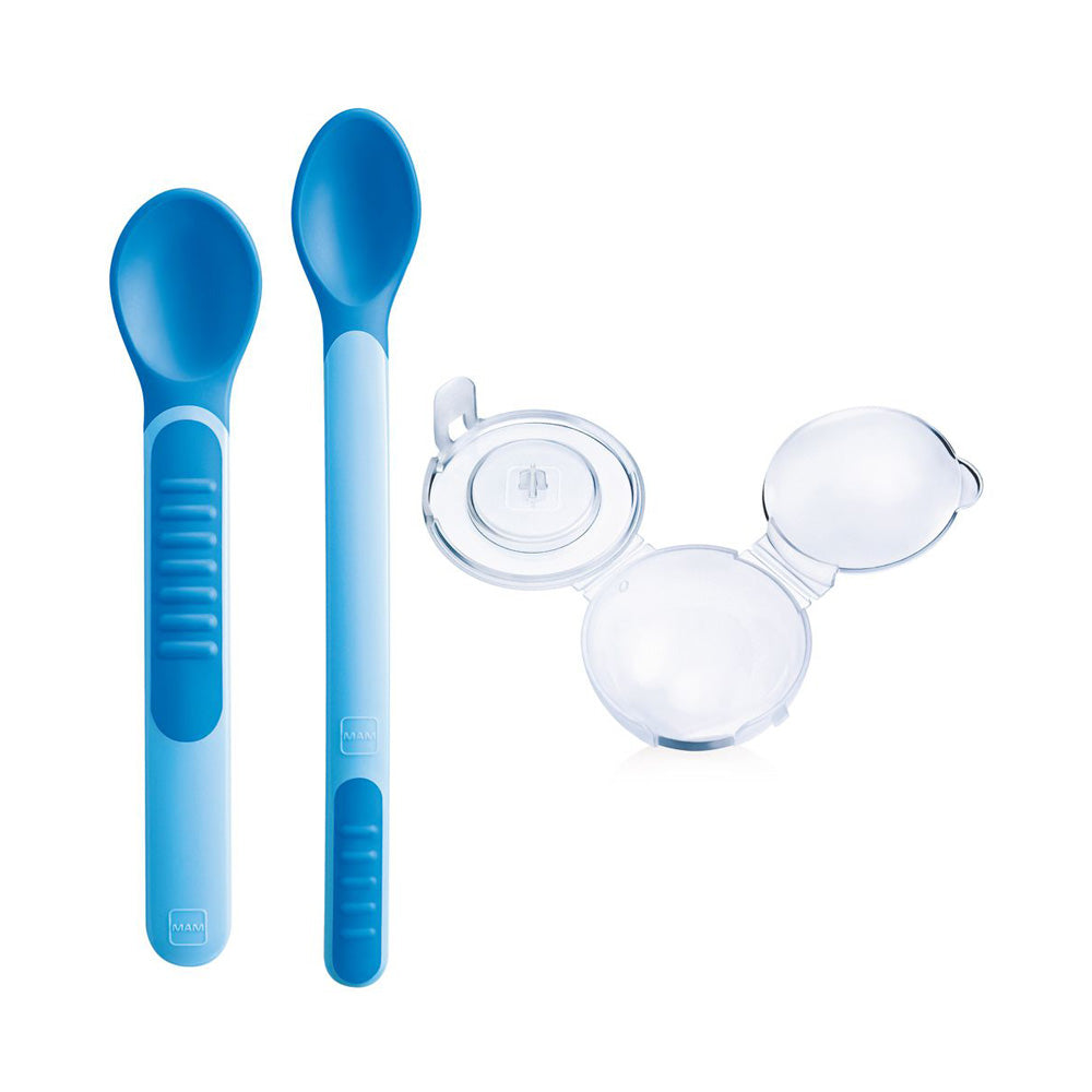 MAM Cuillères+Couvercles d'apprentissage +6m Ils changent de couleur. Les extrémités sensibles à la chaleur changent de couleur...
