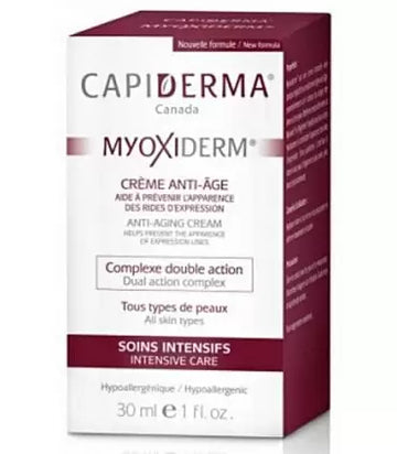 Myoxiderm, est une crème formulée avec principal objectif de réduire les micro-crispations subies par la peau, essentiellement sur le contour des lèvres et des yeux,