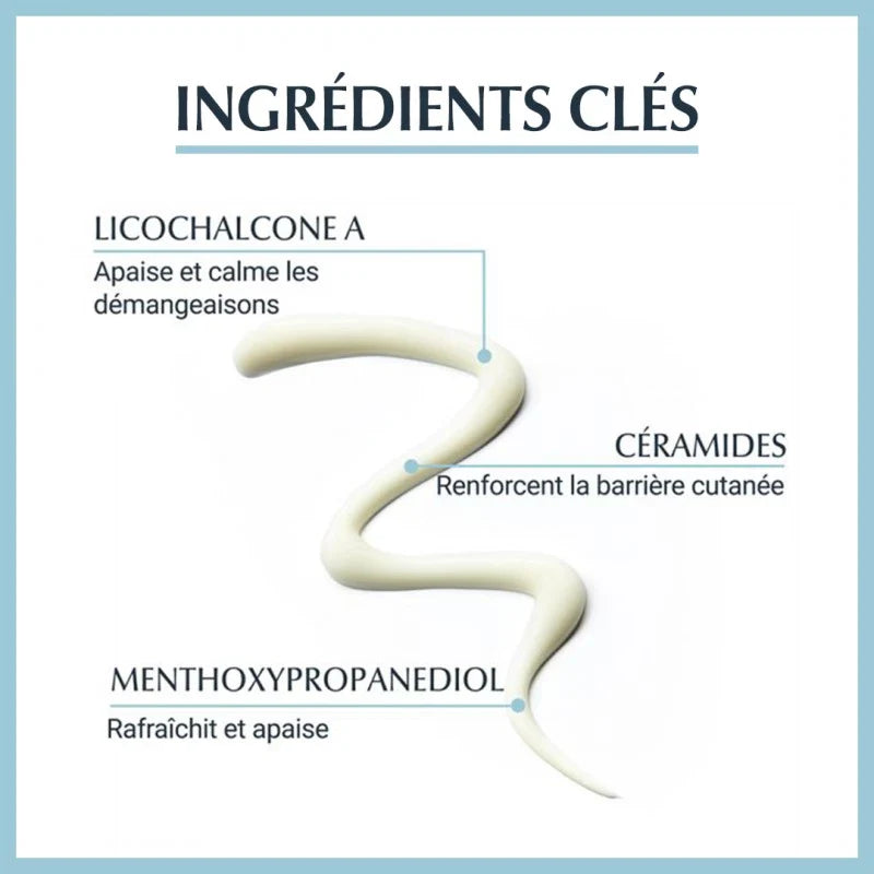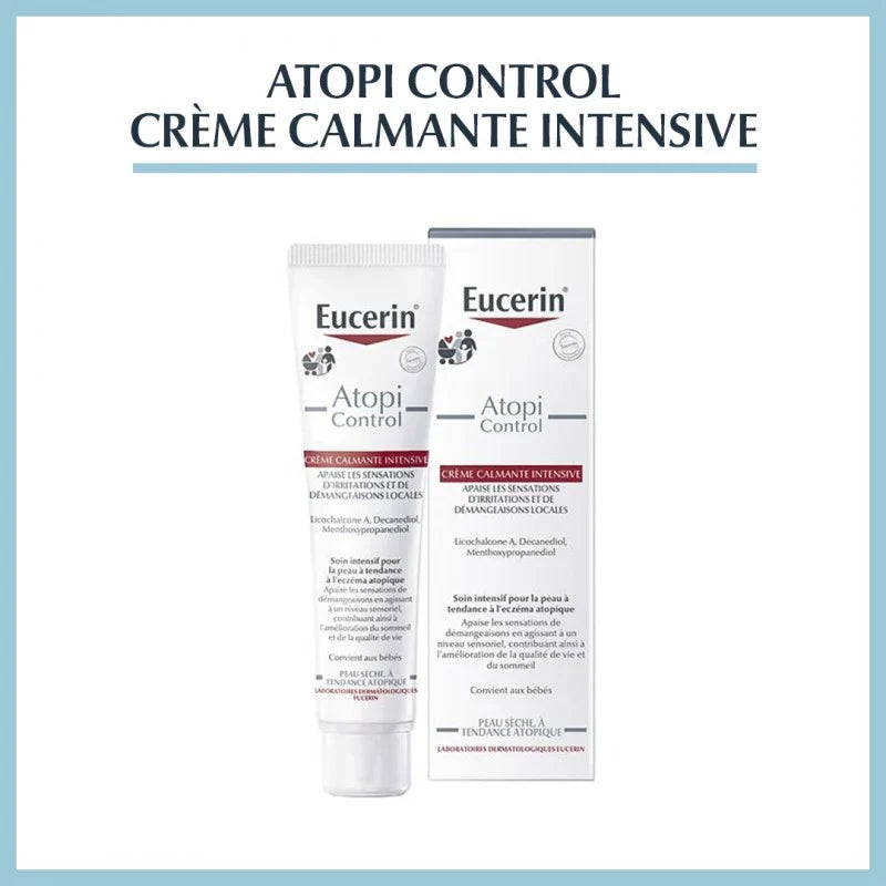 EUCERIN AtopiControl Crème Calmante Intensive a été spécialement formulée pour soulager intensivement les peaux à tendance à l’eczéma atopique. La formule contient un complexe unique d'ingrédients actifs: la Licochalcone A apaisante, le Decandiol anti-bactérien et le Menthoxypropandiol (MPD) anti-irritant et rafraîchissant. Ce complexe, associé à une concentration élevée en céramides, renforce la barrière cutanée, atténue la sécheresse et soulage les sensations de démangeaisons, réduisant ainsi le besoin de se gratter.