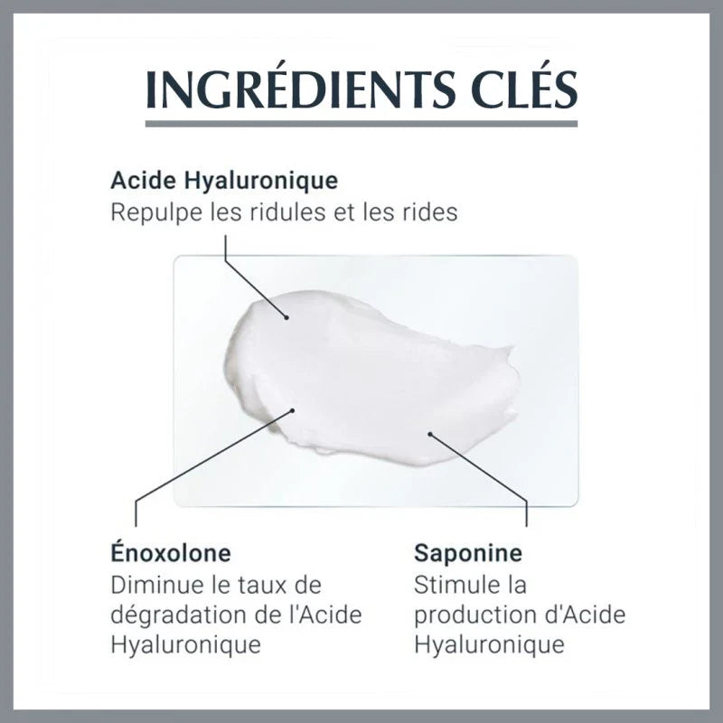 Sa formule unique combinant de l’Acide Hyaluronique de haut et de bas poids moléculaire, de la Glycine Saponine et de l'Enoxolone offre une approche ciblée pour combler visiblement les rides, même les plus profondes, pour une peau à l’apparence plus jeune. L’Acide Hyaluronique de haut poids moléculaire améliore l’hydratation et lisse les couches supérieures de la peau tandis que l’Acide Hyaluronique de bas poids moléculaire, qui est 40 fois plus petit1, pénètre plus profondément dans les couches de l’épiderme où naissent les rides plus profondes. La Glycine Saponine, un anti-oxydant, soutient la production d’Acide Hyaluronique dans la couche cutanée où se forment les rides les plus profondes et protège des radicaux libres. L'Enoxolone prévient la dégradation de l'Acide Hyaluronique présent dans la peau.