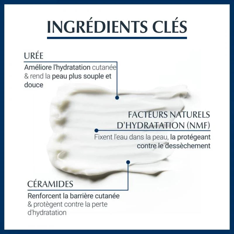 - De l'urée et des facteurs naturels d'hydratation (NMF) fixant l'humidité pour hydrater les couches supérieures de la peau.