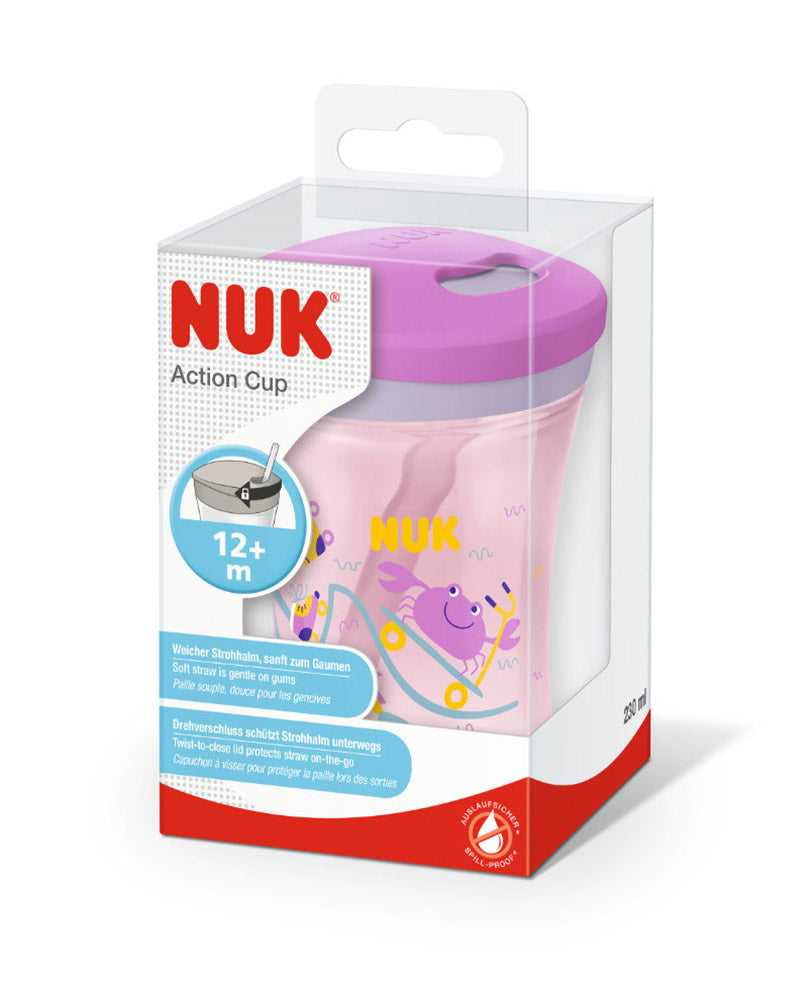 La tasse Action NUK est parfaite pour les bébés et les jeunes enfants dont le besoin de bouger et le rayon d'action augmentent chaque jour. La paille flexible et extrêmement souple s'adapte à toutes les activités. Elle permet de boire facilement tout en étant particulièrement douce pour le palais et les gencives. Pour le transport, la paille disparaît dans le couvercle en un tour de main. Ainsi, elle ne peut ni couler ni se salir.