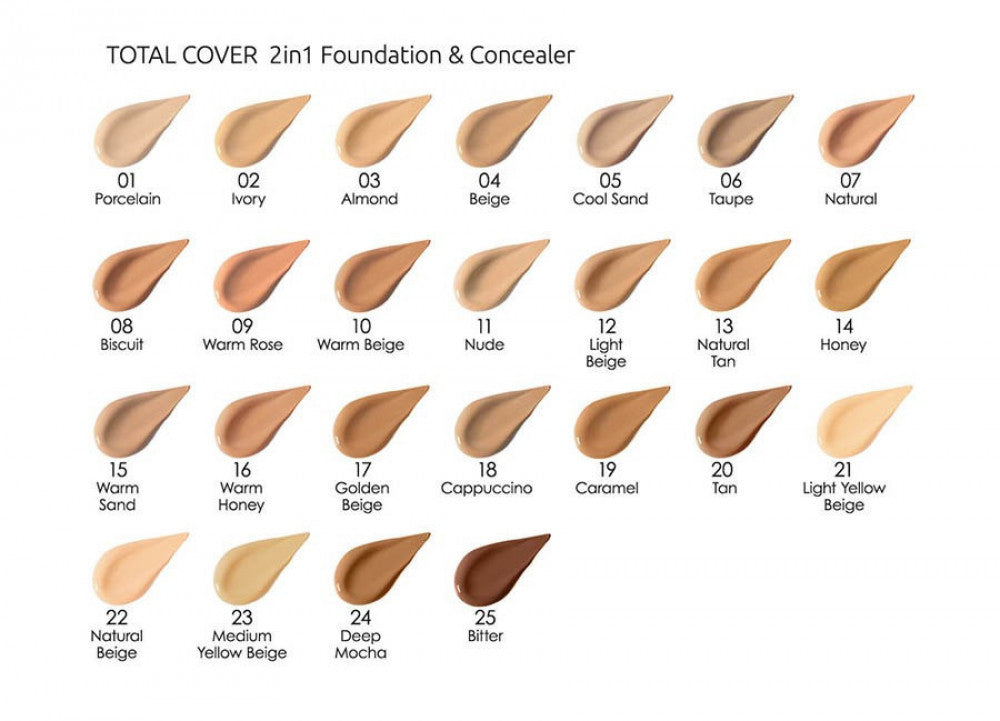 Le fond de teint et le correcteur Total Cover 2in1 égalisent le teint lorsqu'il est appliqué comme un fond de teint intégral et fonctionne également comme un correcteur de couverture complète en une seule étape. Sa formule légère et non grasse procure une couverture complète à assembler pour un look doux et impeccable qui dure toute la journée. Contient de la vitamine E et du FPS 15 protège la peau contre les rayons nocifs du soleil.