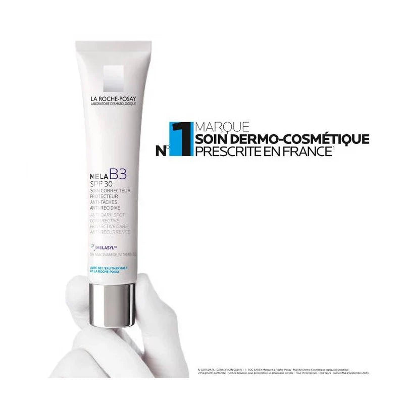 De la perte d'éclat aux taches persistantes : MELA B3 SPF 30 est le nouveau soin correcteur et protecteur qui cible l'hyperpigmentation, grâce au Melasyl™ multibreveté et à la Niacinamide concentrée à 5% pour corriger les taches brunes persistantes. Il est associé à une protection SPF30 + UVA pour prévenir l'apparition de nouvelles taches. Innovation hyperpigmentation Melasyl™ multibreveté : le nouvel actif pour combattre l'hyperpigmentation comme jamais auparavant.